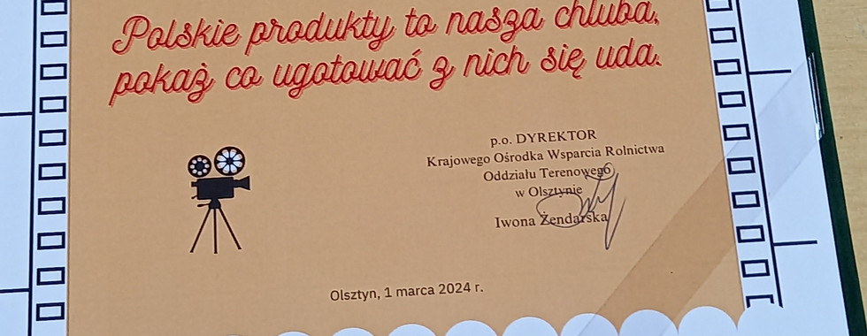 Zawsze bardzo nas cieszy, gdy uczniowie odnoszą sukcesy, zwłaszcza w tym, co lubią robić. Rozpoczynając naukę w technikum i wybierając przyszły zawód młodzi ludzie czasami robią to bez przekonania, bo tak naprawdę, z racji wieku, sami jeszcze nie wiedzą czy to na pewno słuszna ścieżka zawodowa. Wyczekiwane są takie momenty jak ten, gdy 1 marca 2024 r. na auli szkolnej odbyło się ogłoszenie wyników Amatorskiego Konkursu Filmowego "Polskie produkty to nasza chluba - pokaż co ugotować z nich się uda", którego organizatorem był Krajowy Ośrodek Wsparcia Rolnictwa Oddział Terenowy w Olsztynie. Wtedy Dominika i Zofia zgodnie stwierdziły, że są przekonane o słuszności wyboru zawodu. Chcą gotować, karmić i cieszyć zmysły potrawami.